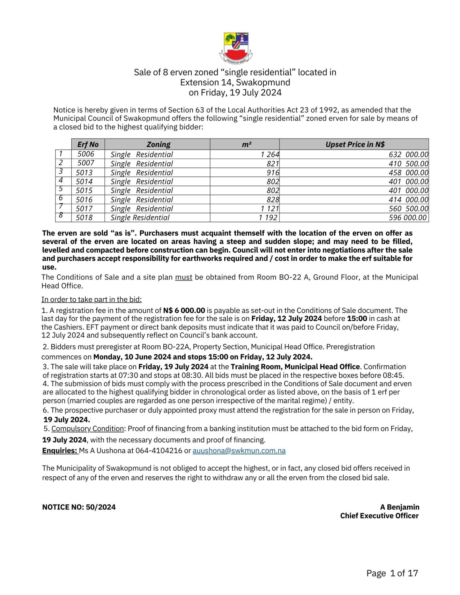 Sale Of 8 Erven Zoned “single Residential” Located In Extension 14 Swakopmund On Friday 19 July 2024
